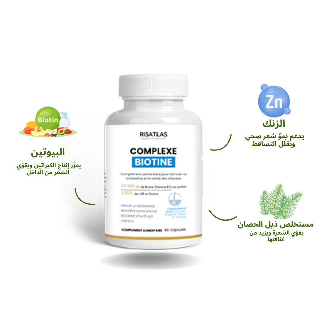 كومبلكس البيوتين ريساتلاس هو المكمّل الغذائي الأول في المغرب المخصّص لعلاج تساقط الشعر من الداخل.