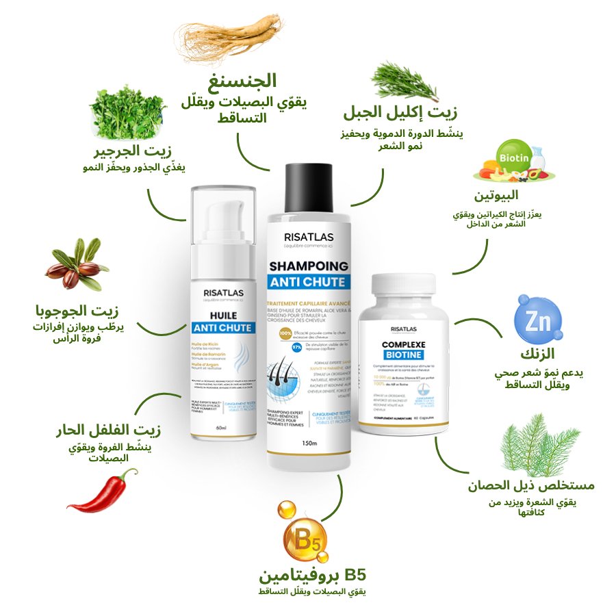 زيت ريساتلاس: يحتوي على زيت الجرجير، الجوجوبا، الأزير، والفلفل الحار. يحفّز النمو ويغذّي الشعر من الجذور حتى الأطراف.